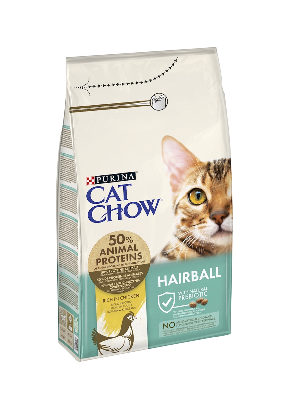 100% complete and balanced recipe. Formulated with chicory, a natural prebiotic that is proven to help improve digestive health of your cat. Carefully prepared with 50% of total protein from animal origin and natural ingredients in a tasty recipe that cats spontaneously prefer. PURINA CAT CHOW is carefully formulated with high quality protein and natural ingredients, such as peas, carrots, wholegrain cereals, chicory and yeasts. Specially formulated with sources of fibre proven to carry away twice as much hair from the stomach. Particularly suitable for cats living indoors. No added artificial colorants, flavourings or preservatives.